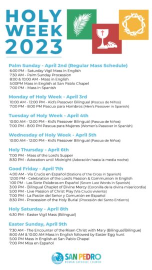For those looking to participate in San Pedro’s traditional activities, the San Pedro Roman Catholic Church will host its annual religious Easter celebration, including the Stations of the Cross and Easter Sunday mass and procession. Full schedule below: