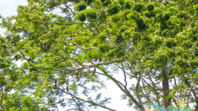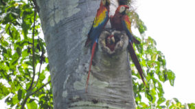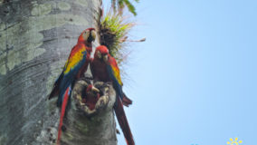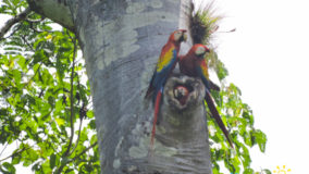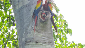 In a distant tree, we see flashes of bright red, blue and yellow, and then we spot a pair of beauties on a branch. Using binoculars for a better look, we count several busy parrots in the same tree, at least six of them, what an amazing sight!