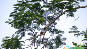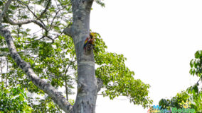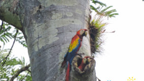 And then we hear it…the cacophony of squawking Scarlet Macaws! What a racket they make, but thank you for letting us know where to look for you pretty parrot!