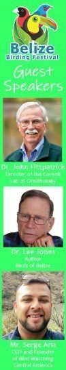 Guest speakers this year include Dr. John Fitzpatrick, American ornithologist primarily known for his research work on the South American avifauna and Director of the Cornell Lab of Ornithology, will discuss How Can Birds Save the World. Dr. Lee Jones, author of the well-known Birds of Belize book, will hold a workshop presentation on the identification of Shorebirds of Belize and Serge Aria, CEO and Founder of Bird Watching Central America, will present on the development and sustainability of bird-based tourist destinations regarding International markets and opportunities for Belize and Central America. These birding experts will also partake in select tours on the morning of the 20th.