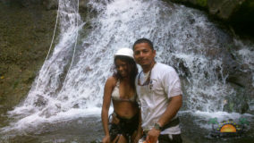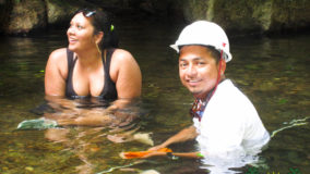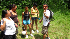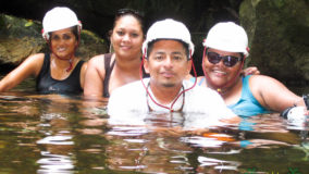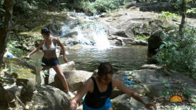 Lunch was a choice of chicken or fish wraps and vegetarian quesadillas. Washing down our meals was some ice cold water and coconut water, fresh from the coconut trees outside. Anthony Hunt, our tour leader, was generous enough to treat us all to a refreshing Belikin, and with libations ingested, we all switched into our swimming things and jump into the waiting vehicles to trek to our next destination: Bocawina Falls. There, our next mission was to put our fate into the strength of a few ropes and pulleys, and our upper body strength, to get from the top of the falls to the waiting pools below. Easy peasy!