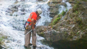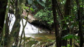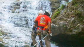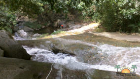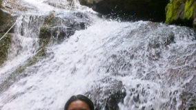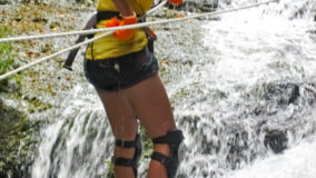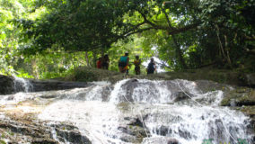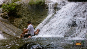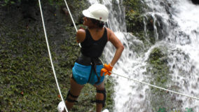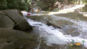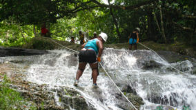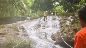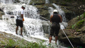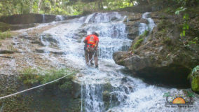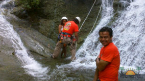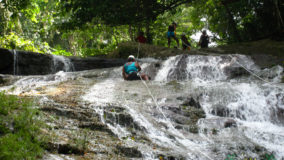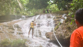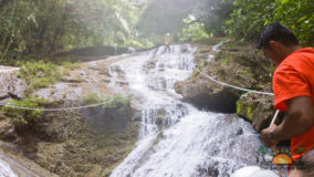 Encouraged by their bravery, I decide to step up. After being strapped in, and another mini demonstration, I take a step backwards and KERPLUNK! I fall flat on my behind, and I swear I bounced. Not very encouraging, but with that embarrassing misstep, my fear of falling is over. If I can fall standing on flat ground, and survive, I am sure there’s nothing wrong with slipping and sliding a bit down the falls. Legs spread, my right hand feeding rope, and leaning backwards, I begin the descent. The first few steps are on dry boulder, but soon, I’m touching rushing waters. Now past the point of fear, I’m all about survival. I slip, slide and step, managing to scale the face of Bocawina Falls with much grunting and effort. I didn’t think it was possible to sweat while in the face of cool rushing waters, but I defied nature as I huffed and puffed my way down.