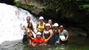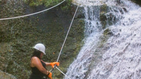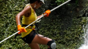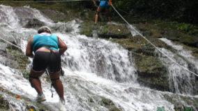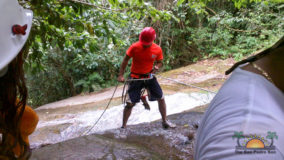 A ten minute walk up a trail led to the roaring falls, where cool waters rushed a hundred feet down giant boulders and into a shimmering pool. Sweaty and ready to cool off, our first instinct is to jump into one of the smaller eddies at the top to refresh ourselves before our toughest assignment of the day. From below, the falls didn’t seem quite as high, but now as we frolic up above, the reality of having to scale down hits everyone. I begin to wonder if I can back out. There are actually a few of us who are having second thoughts, but Mercie and Felix step up to the challenge, strapped in with kneepads, protective gloves and helmets, and with a quick demonstration from “Mr. Handsome”, they are off, tentatively taking a few backwards steps, while feeding line to swing down further and further down the face of the roaring falls.